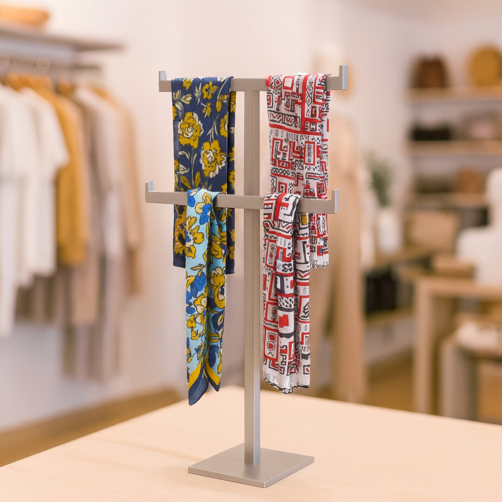 Der Nickel gebürstete Ständer für Accessoires mit Doppel-T-Halter eigenet sich für die Präsentation von Tüchern, Ketten oder Bändern. Der Ständer hat eine Höhe von 30/41 cm und eine Breite von 23 cm. Die Grundfläche ist 10 x 10 cm.