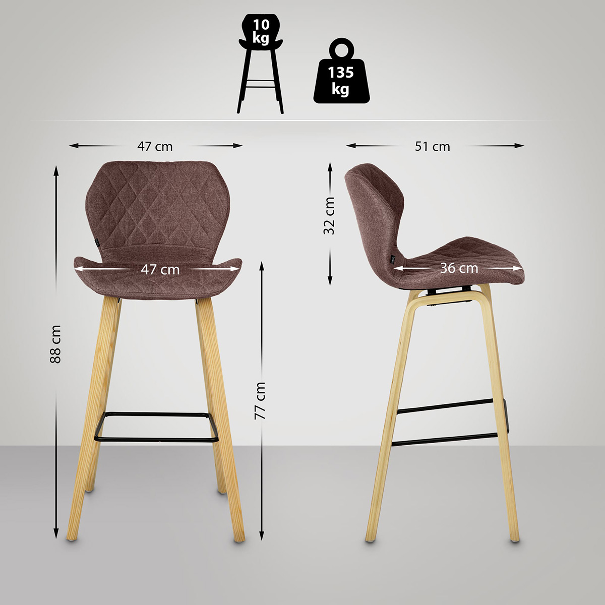 Ebenjenes Vierfußgestell aus stabilem Holz gewährleistet einen sicheren Stand des Stuhls. Dabei kann der Barstuhl bedenkenlos bis 135 kg belastet werden. Dank der Bodenschoner unter den Stuhlbeinen werden empfindliche Böden dabei nicht beschädigt.