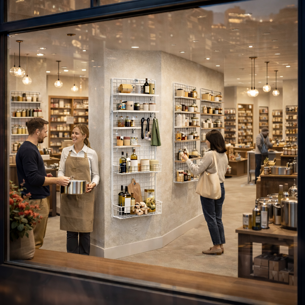 So kann Ihre Ladeneinrichtung mit dem weißem Deko Drahtgitter-Set individuell und sehr modern gestaltet werden.