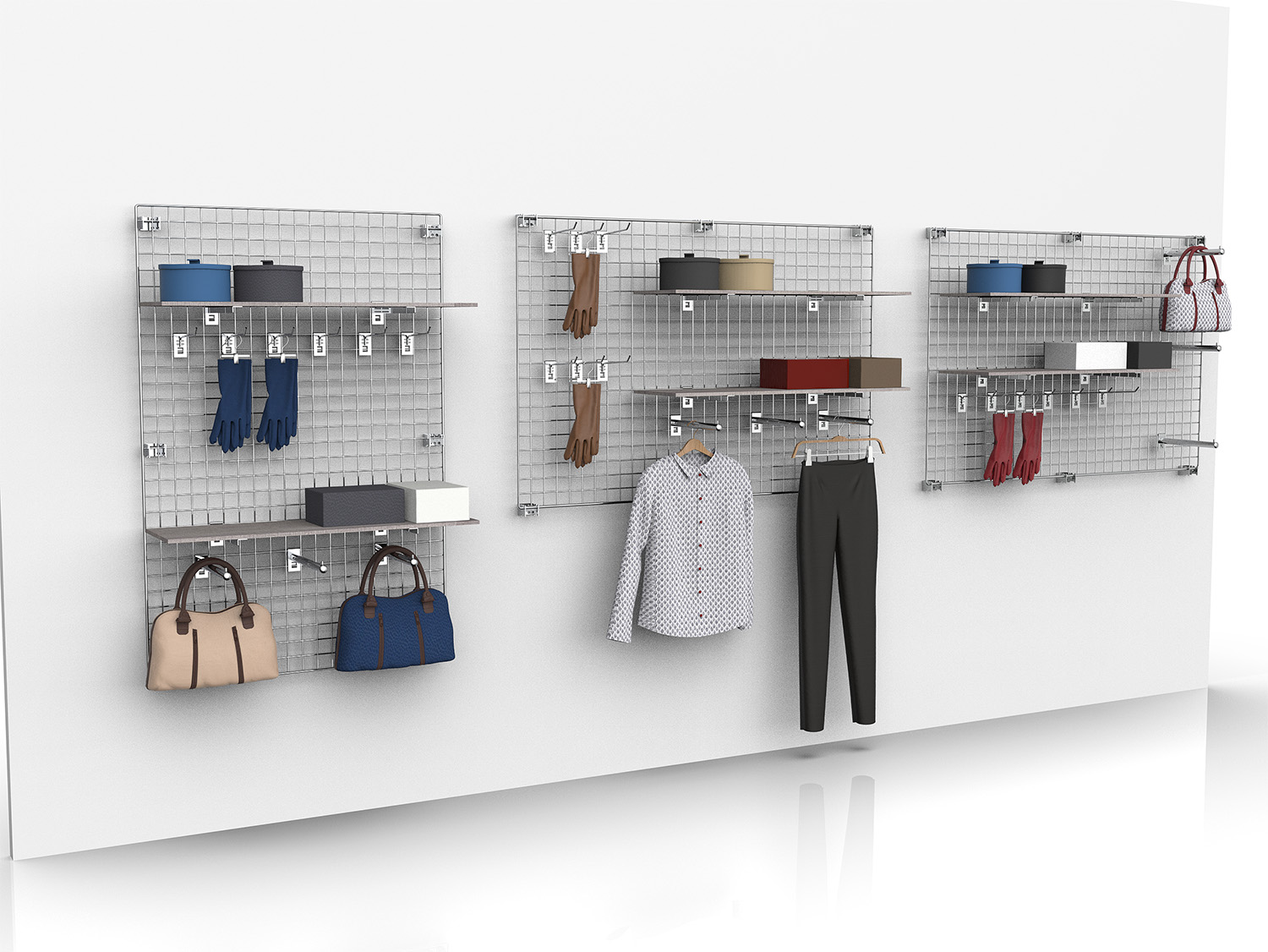 Das moderne Deko Wandgitter in weiß ist optimal in jeder Textil Ladeneinrichtung im Einzelhandel einsetzbar.