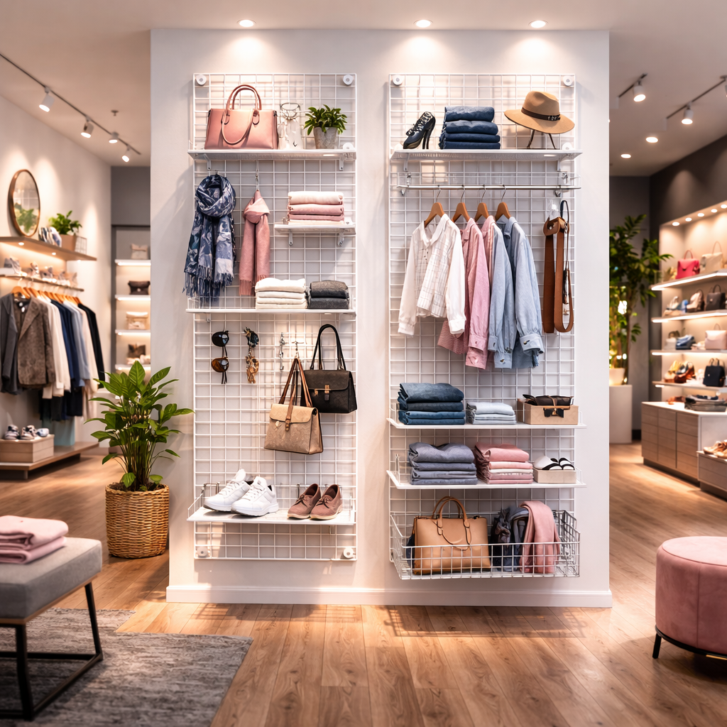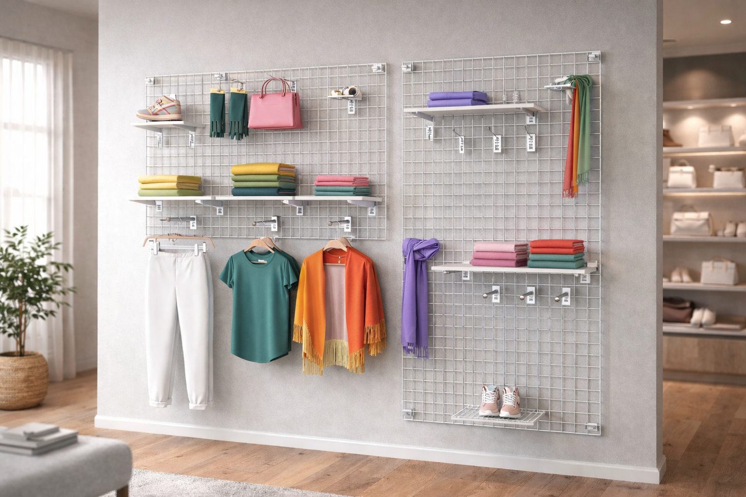 Das hochwertige Deko Wandgitter im Set ist optimal in der Ladeneinrichtung von Textilläden integrierbar.
