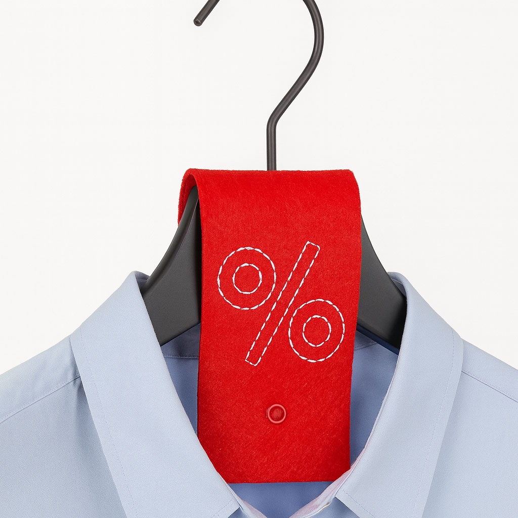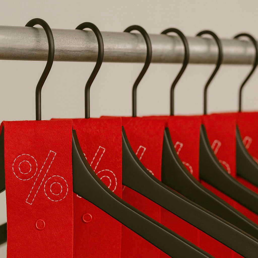 Der Bügelhänger aus Filz in der Farbe rot ist mit einer weißen Stickerei "%" versehen. Mit dem Textilhänger lässt sich kinderleicht reduzierte Ware kennzeichnen.