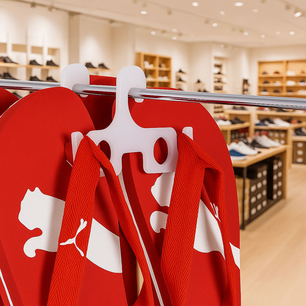 Der Flip-Flop-Halter ist aus weißem Kunststoff und hat die Maße 10 x 8 cm. Die Verpackungseinheit der Flip-Flop-Halter ist 250 Stück. Der Preis ist pro Verpackungseinheit.