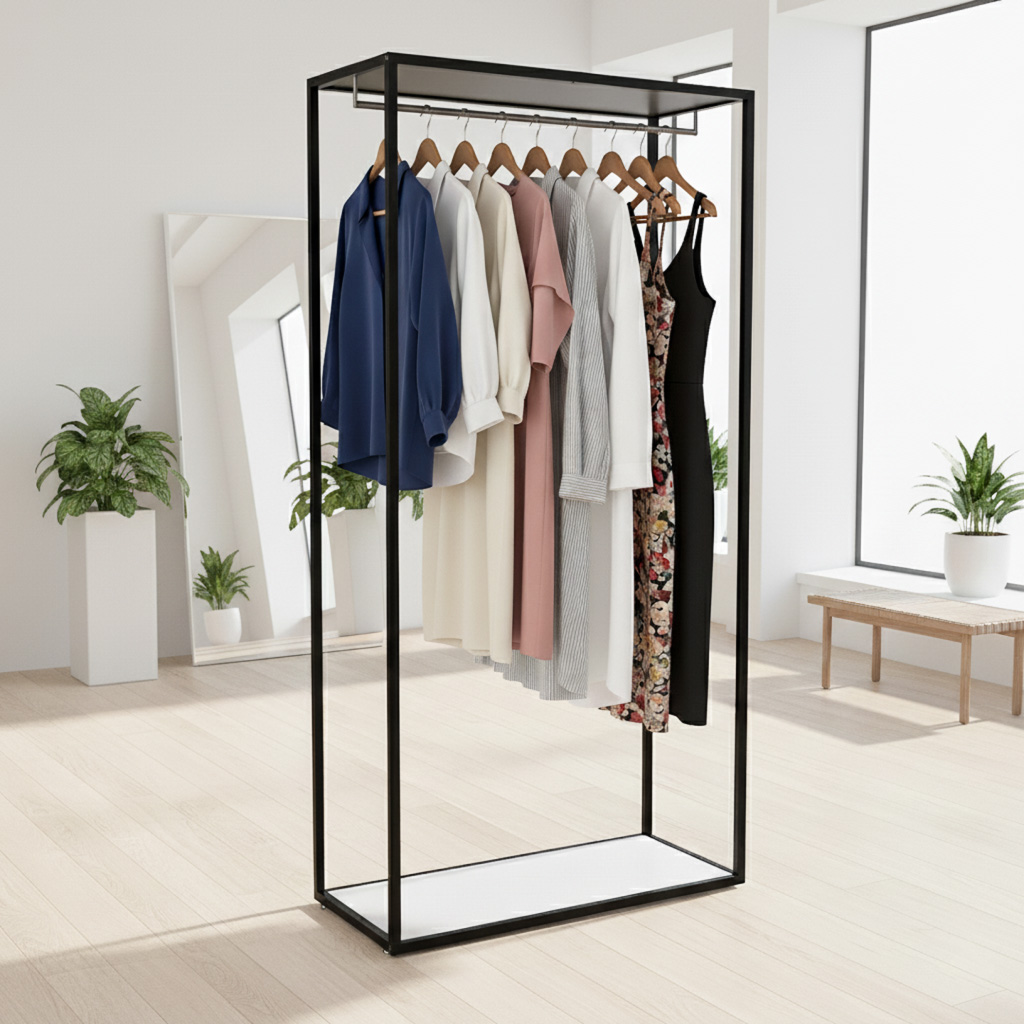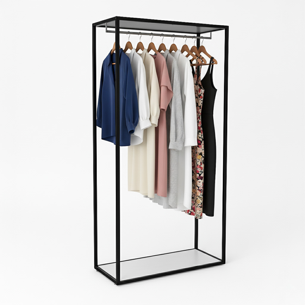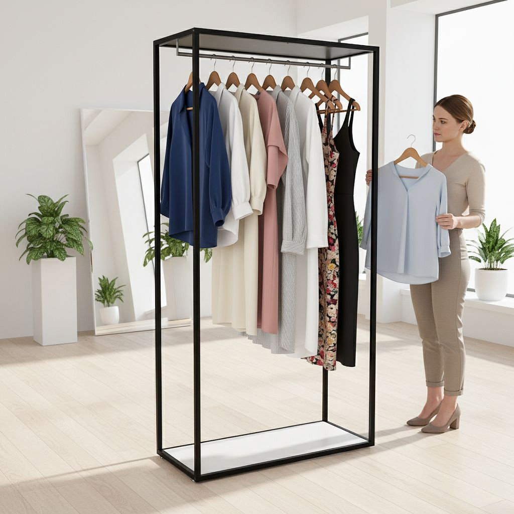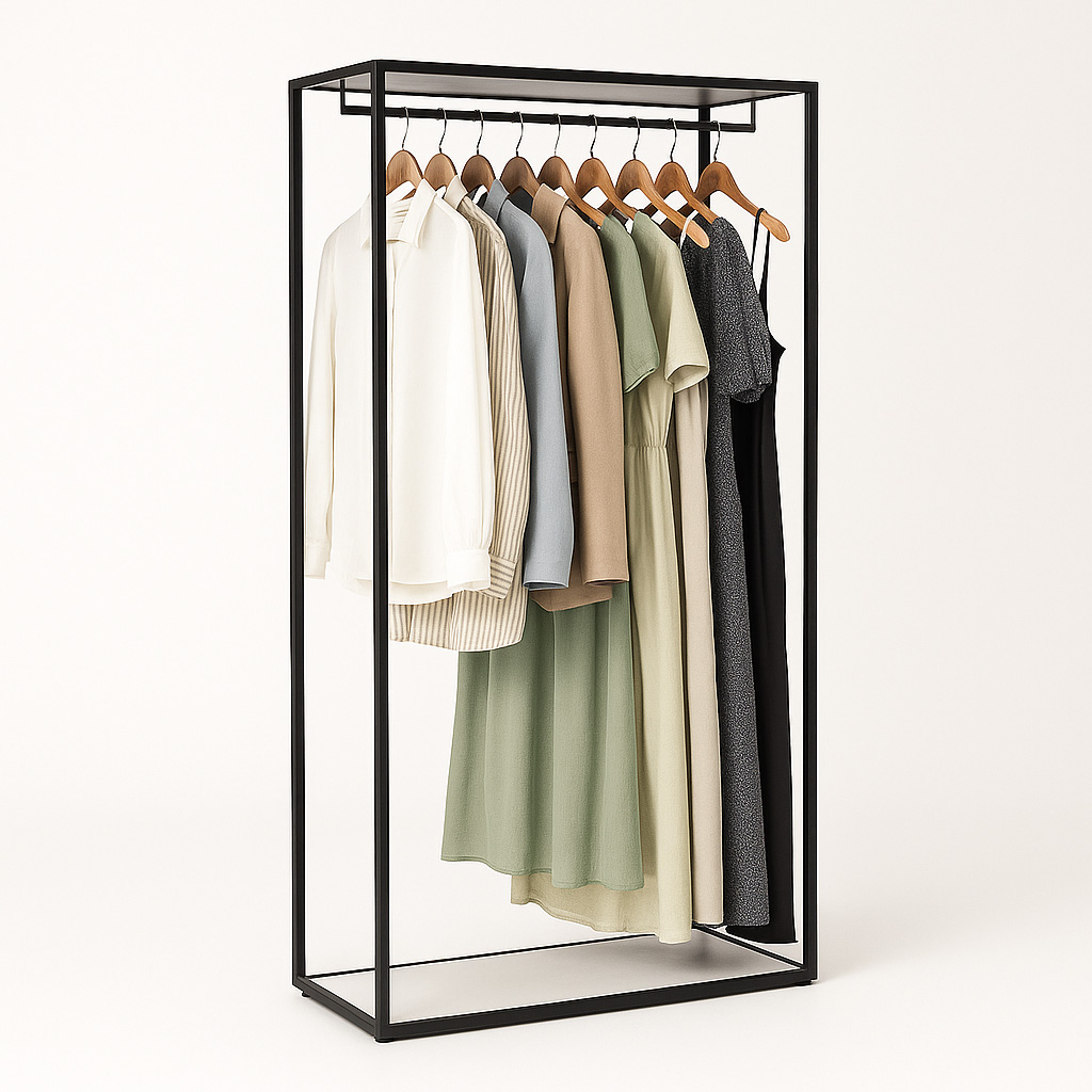 - Extras: integrierte Kleiderstange für hängende Ware