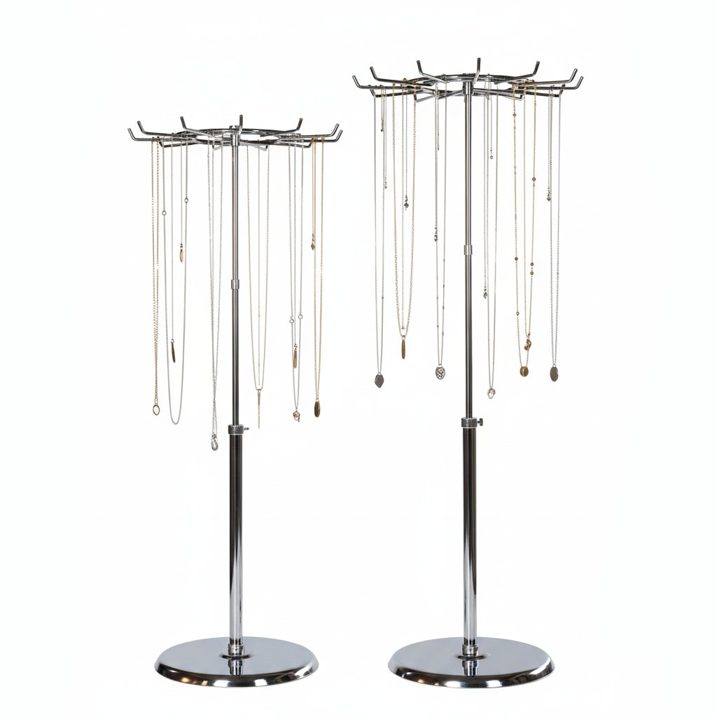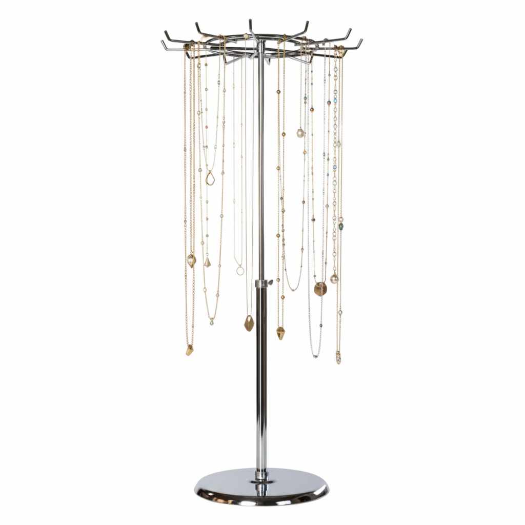 Dieser schöne Ständer für Ketten ist von 50 - 75 cm höhenverstellbar & drehbar und passt perfekt auf jede Ladentheke. Der Hakenring mit Durchmesser 30 cm hat 12 Haken zur perfekten Präsentation von Halsketten. Der komplette Kettenständer ist verchromt.