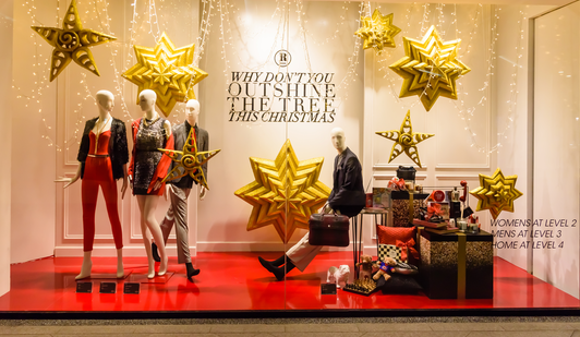 Les vendeurs s’adressent aux clients potentiels en présentant leurs gammes d’articles sur des mannequins dans les vitrines. Une boutique de mode à prix relativement bas, pourra toucher ses clients avec des mannequins décorés et de grandes affiches. Une boutique luxueuse pourra quant à elle atteindre sa cible en présentant une sélection d’articles haut de gamme dans la vitrine extérieure et sans étiquettes de prix.