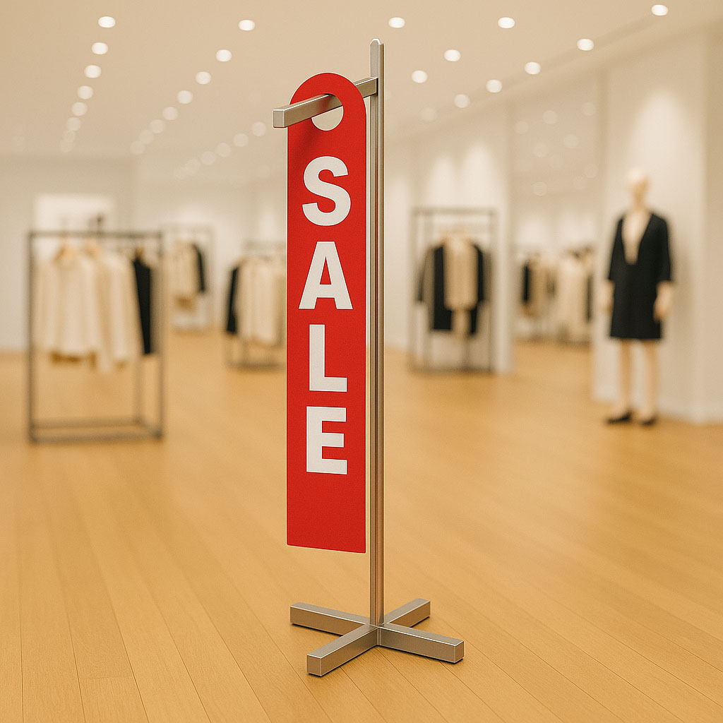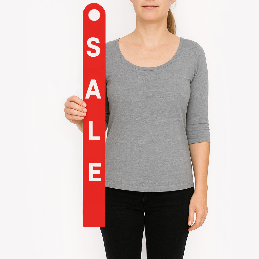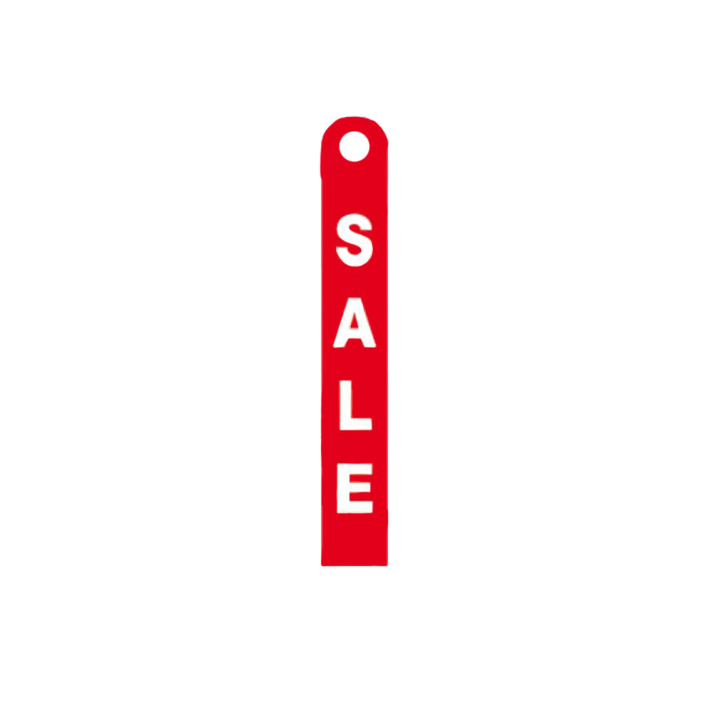 Für die Rabattkennzeichnung direkt am Kleiderbügel eignet sich dieser Hänger für Kleiderbügel aus Hart-PVC. Der Hänger ist rot mit weißem Sale Aufdruck. Die Maße des doppelseitigen Hängers sind 10 x 68 cm.