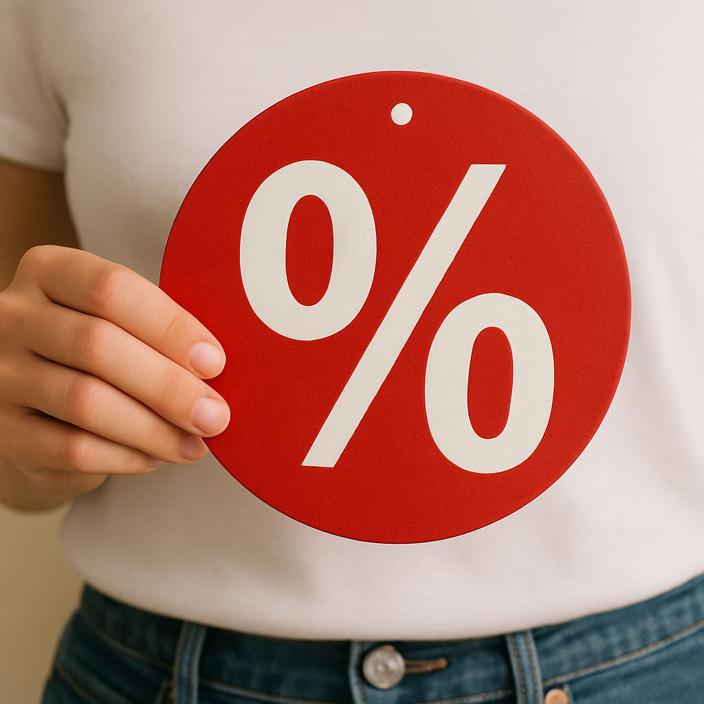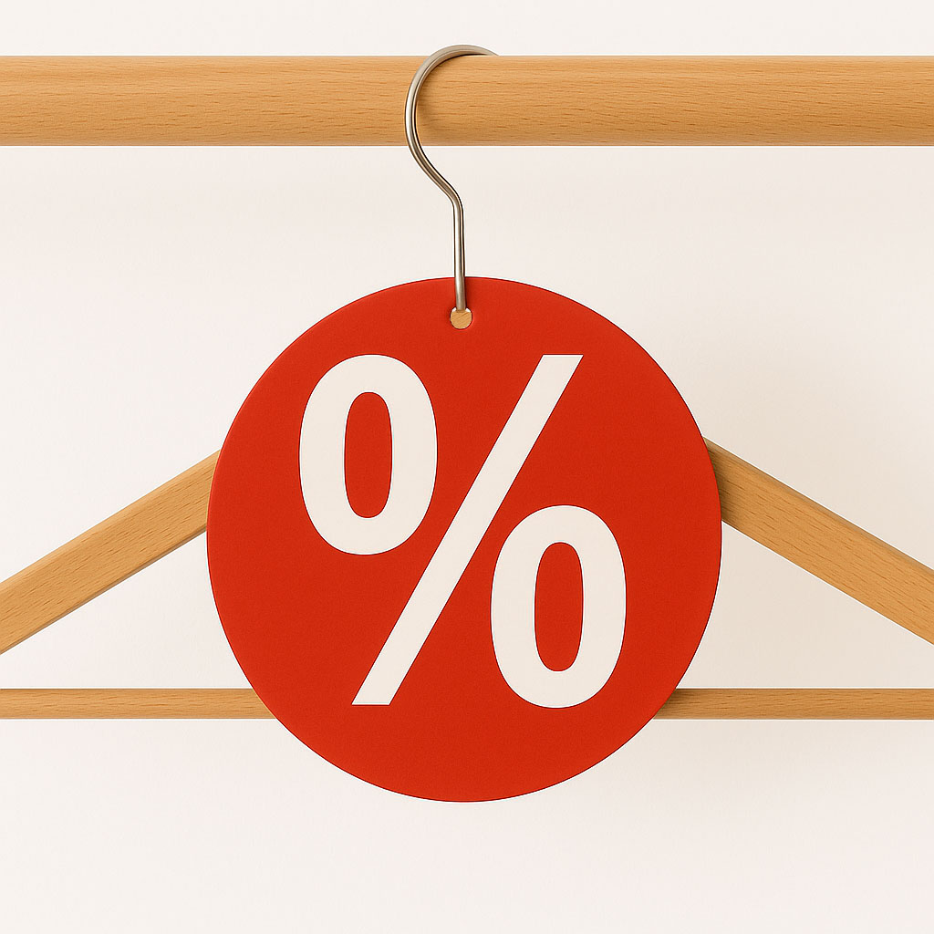 Für die Rabattkennzeichnung direkt am Kleiderbügel eignet sich dieser doppelseitige Hänger aus Karton. Der Hänger ist rot mit weißem '%' Aufdruck. Der Durchmesser ist 12 cm, die Verpackungseinheit 10 Stück. Der Preis ist pro VE.