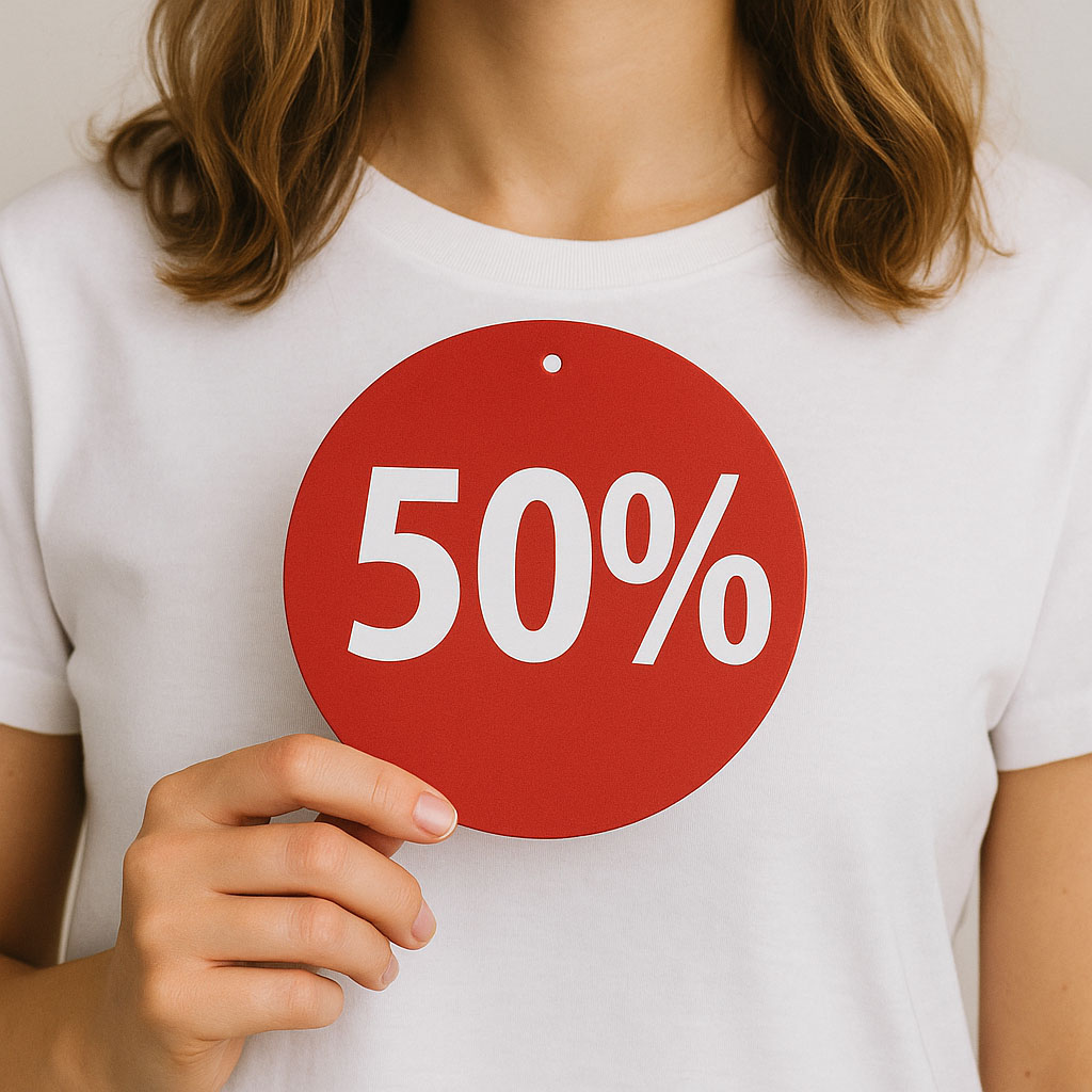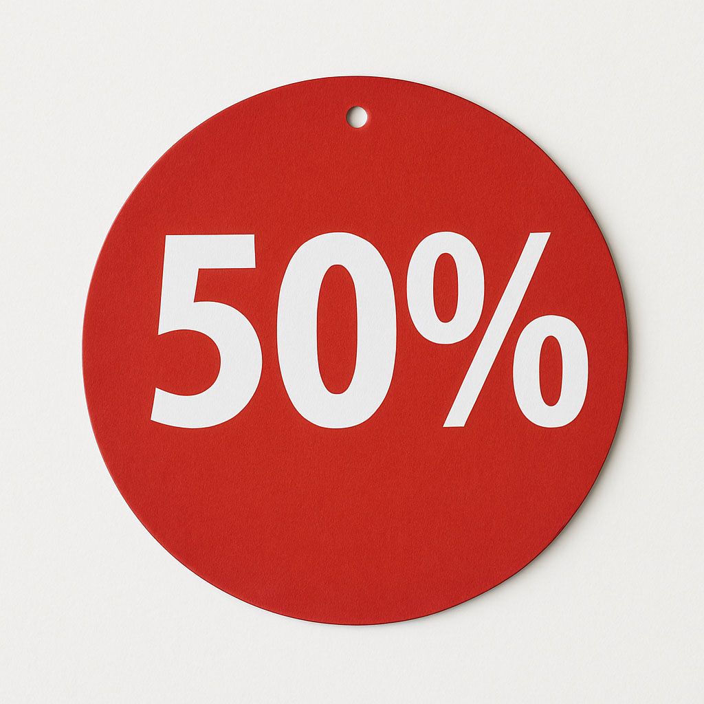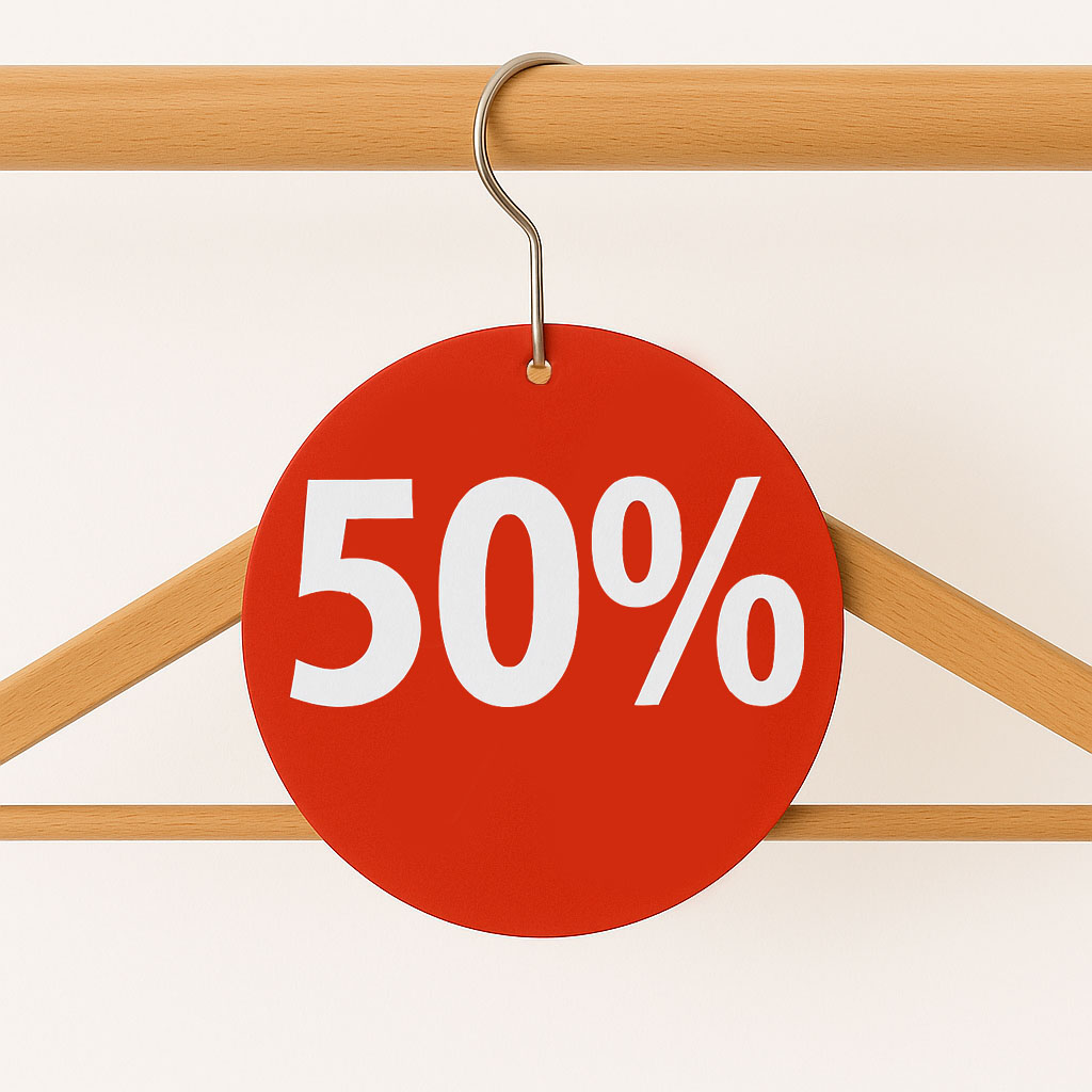 Für die Rabattkennzeichnung direkt am Kleiderbügel eignet sich dieser doppelseitige Hänger aus Karton. Der Hänger ist rot mit weißem '50%' Aufdruck. Der Durchmesser ist 12 cm, die Verpackungseinheit 10 Stück.