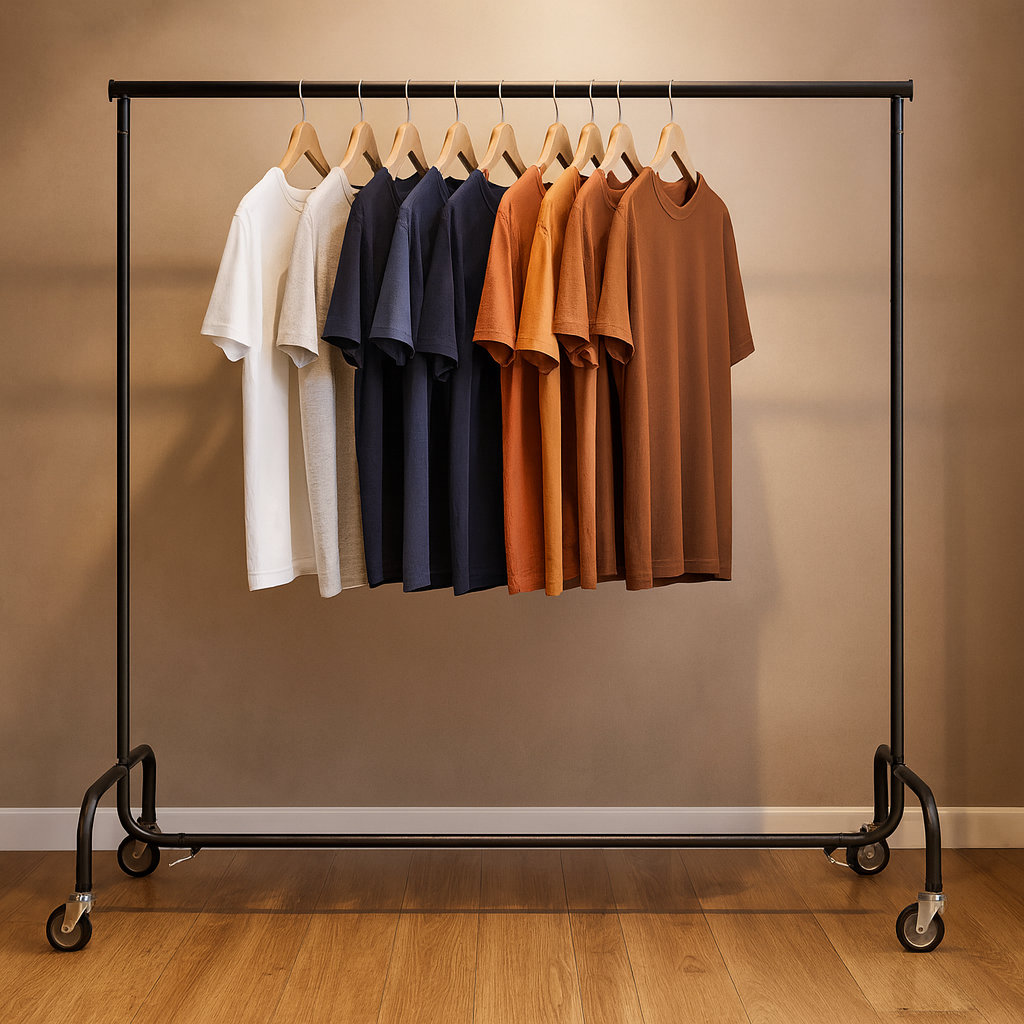 Der schwarz-matte Verkaufsständer ist 143 cm breit und 152 cm hoch. Mit den beiden Ausziehstangen à 38 cm kann eine zusätzliche Aufhängemöglichkeit geschaffen werden. Die Lenkrollen haben einen Druchmesser von 8 cm und sind diagonal gebremst.