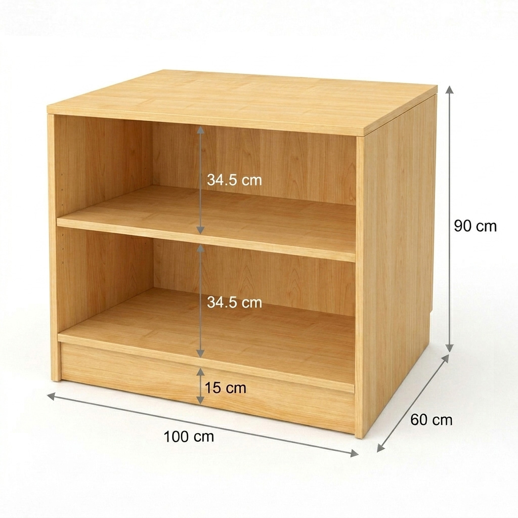 eignet sich ideal für den Verkauf der Ware. Der Verkaufstisch hat eine Tiefe von 60cm, eine Höhe von 90cm und eine Breite von 100cm. Der Sockel hat eine Höhe von 15cm und das Dekor des Verkaufstisches ist Ahorn.