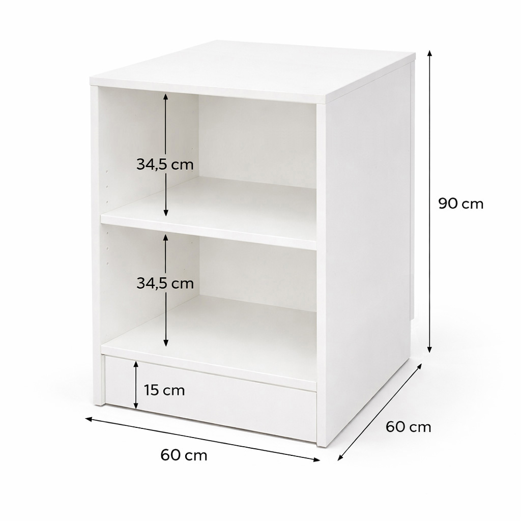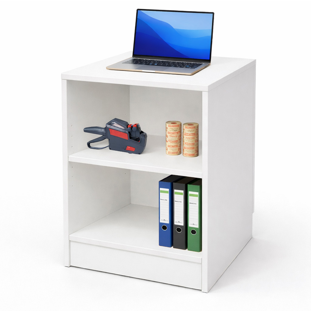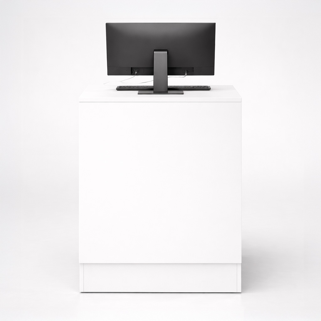 eignet sich ideal für den Verkauf der Ware. Der Verkaufstisch hat eine Tiefe von 60cm, eine Höhe von 90cm und eine Breite von 60cm. Der Sockel hat eine Höhe von 15cm und das Dekor des Verkaufstisches ist weiß.