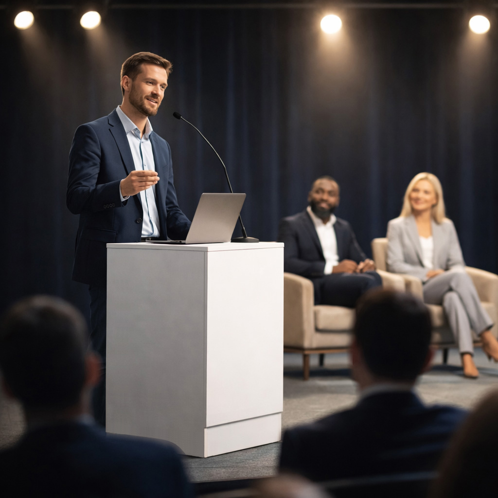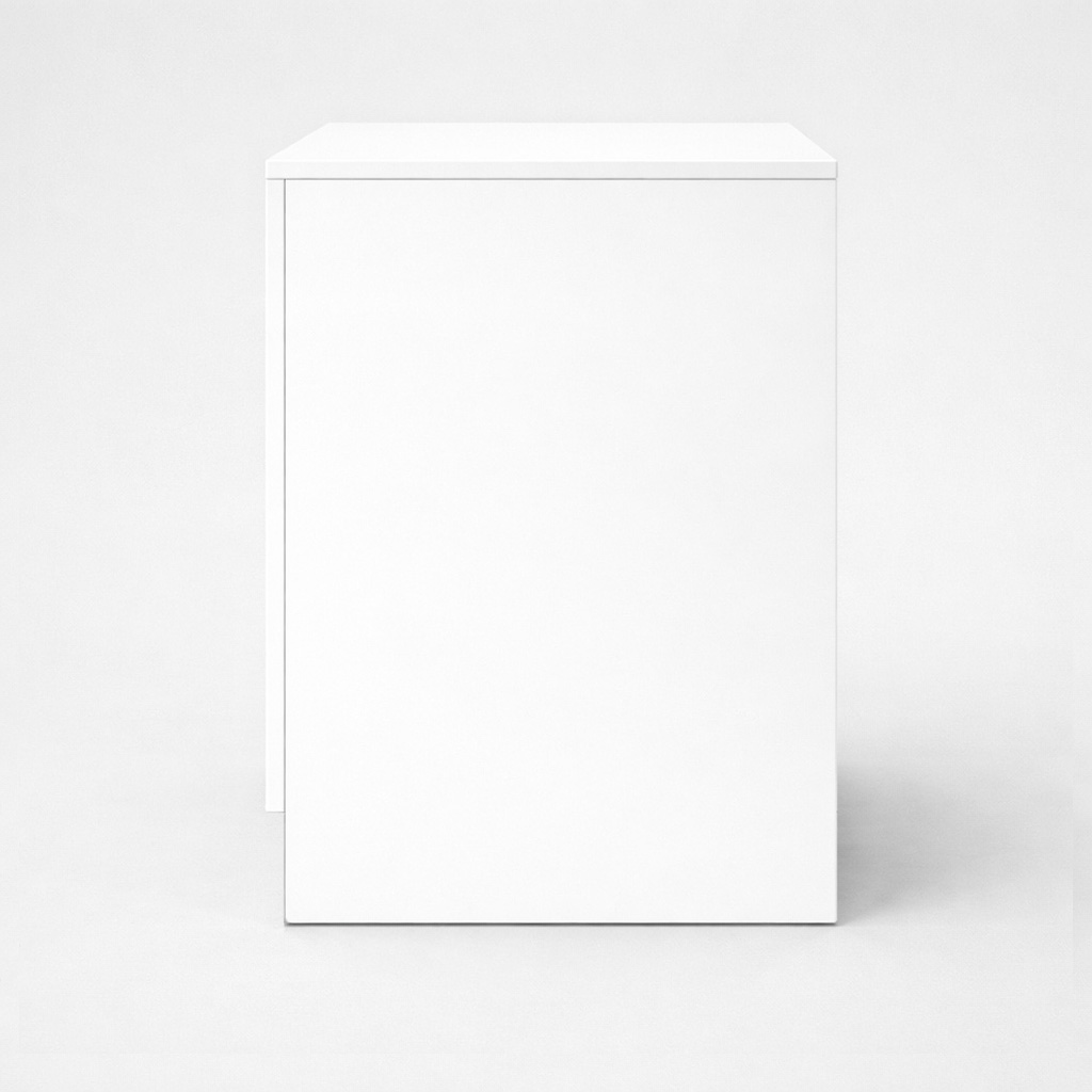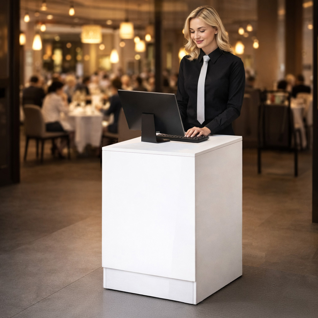 eignet sich ideal für den Verkauf der Ware. Der Verkaufstisch hat eine Tiefe von 60cm, eine Höhe von 90cm und eine Breite von 60cm. Der Sockel hat eine Höhe von 15cm und das Dekor des Verkaufstisches ist weiß.