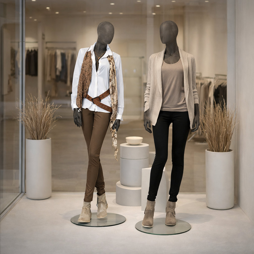 - Lieferumfang: Schaufensterfigur inkl. runder Metallstandplatte