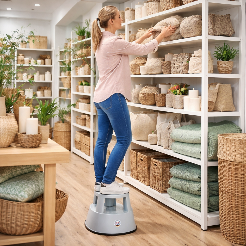 Die Montage ist kinderleicht und ohne Werkzeuge möglich: Einfach Ober- und Unterteil zusammenstecken und schon kann der Kunststoff Rollhocker in der Ladeneinrichtung verwendet werden.