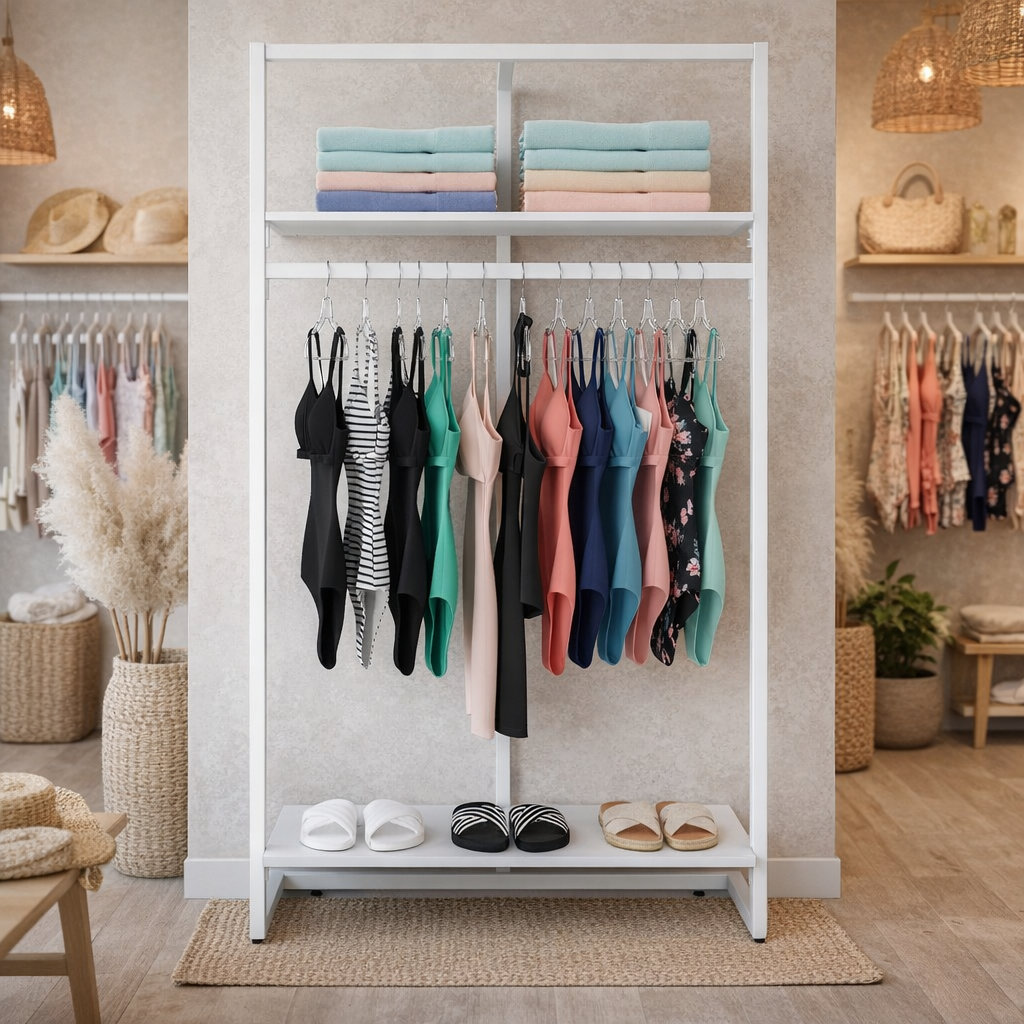 Moderne, weiße Gondel für die Warenpräsentation von Textilien im Textilgeschäft. Der Rahmen ist aus vierkantigem Metall mit 30x30 mm und in Farbe Weiß.